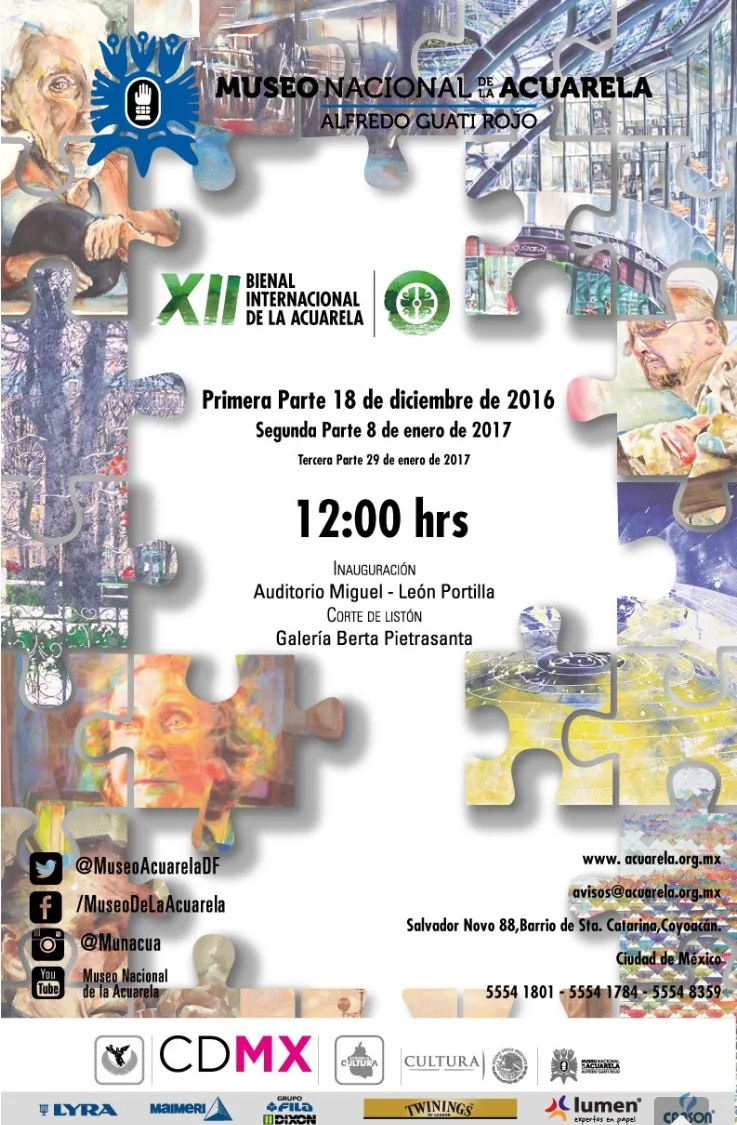 La XII Bienal Internacional de la Acuarela en México, es una exposición que busca mostrar los avances en el uso de esta técnica pictórica y su desarrollo en diferentes latitudes del planeta, así como estrechar los lazos entre diversas asociaciones artísticas. En esta ocasión cuenta con la participación de 224 artistas, de 35 diferentes asociaciones y 24 países, quienes con gran destreza muestran su pasión por el arte a través del agua y el color.